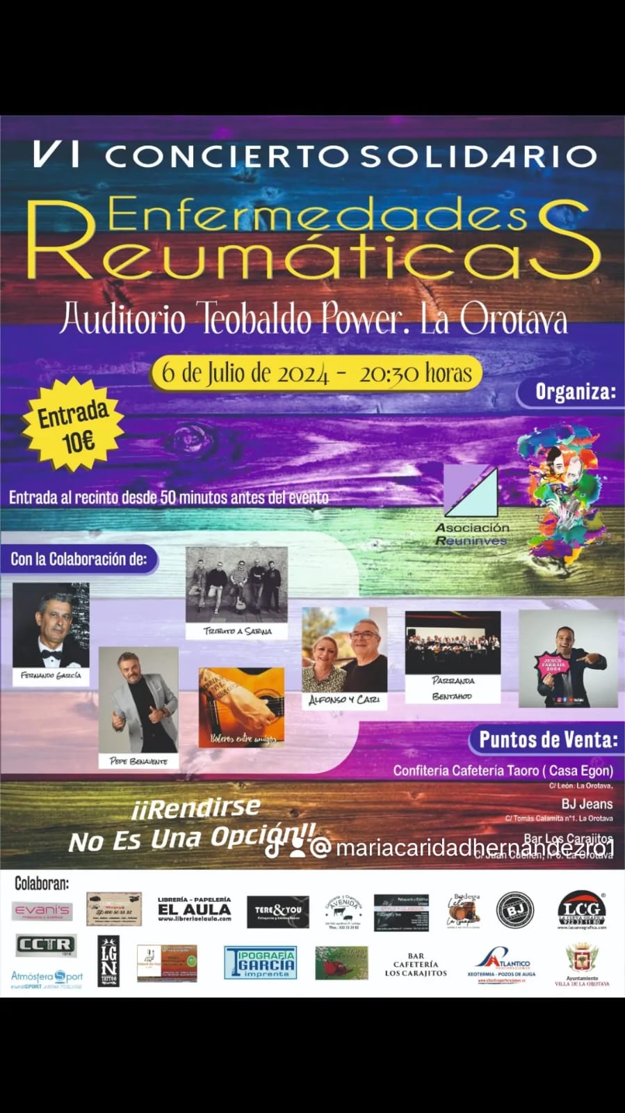 VI Concierto Solidario en favor de las enfermedades reumáticas.  El concierto tendrá lugar el próximo 6 de julio a las 20:30 horas en el Auditorio Teobaldo Power. Se contará con la colaboración de Fernando García, Pepe Benavente, Tributo a Sabina, Boleros entre amigos, Alfonso y Cari, Parranda Bentahod y Jesús Farráis. Las entradas tendrán un precio de 10€ y se podrán conseguir en los siguientes puntos de venta: Confitería Cafetería Taoro (Casa Egon). C/ León. La Orotava; BJ Jeans. C/ Tomás Calamita nº1. La Orotava.; Bar Los Carajitos. C/ Juan Cuellen, nº6. La Orotava.  La entrada al recinto será 50 minutos antes del comienzo del evento. ¡Rendirse no es una opción! Porque a todos nos puede tocar
