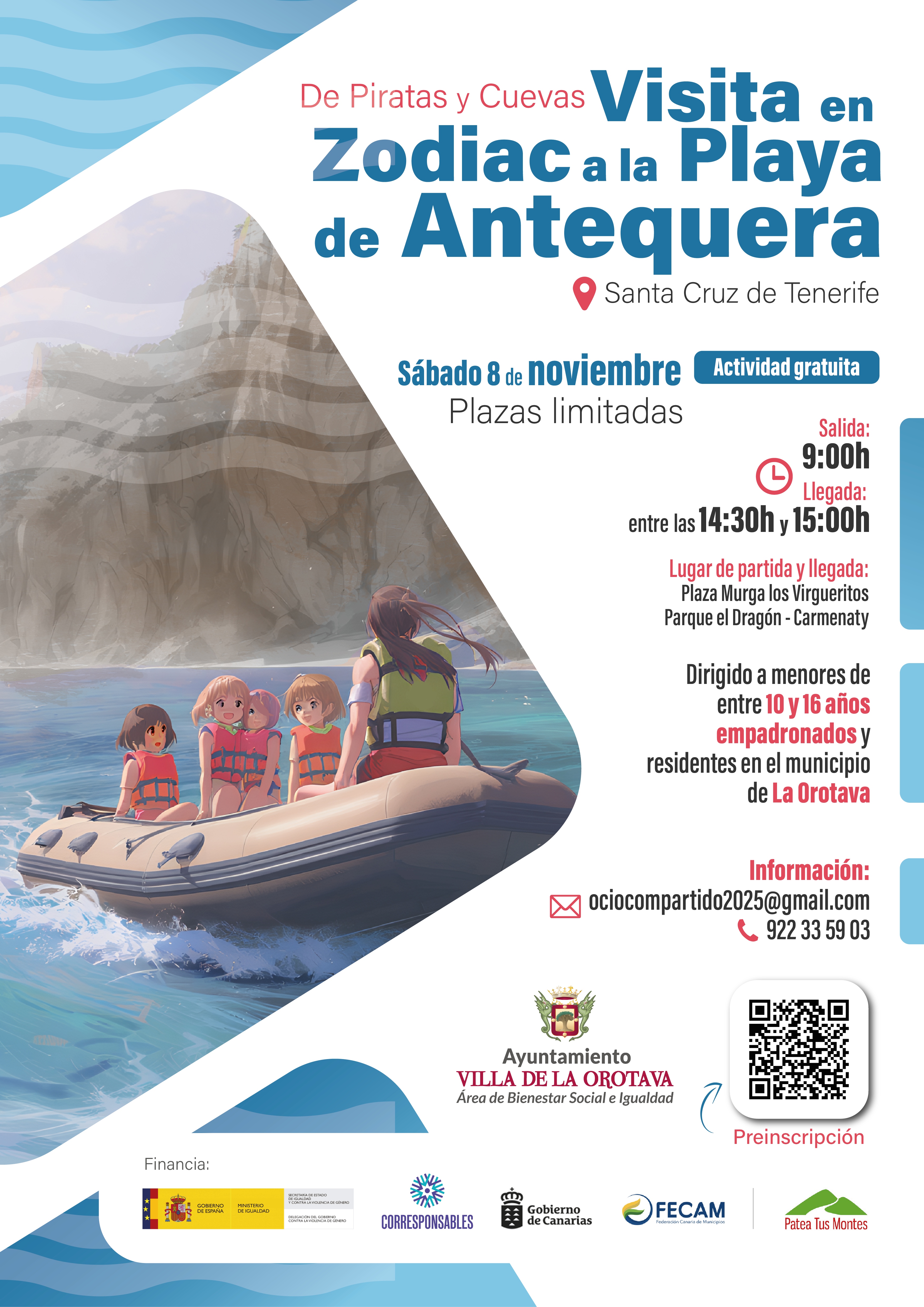 El sábado 8 de noviembre, dentro del programa de Ocio Compartido, se llevará a cabo una emocionante actividad titulada “De piratas y cuevas”, que consistirá en una travesía en Zodiac hasta la playa de Antequera, en Santa Cruz de Tenerife.