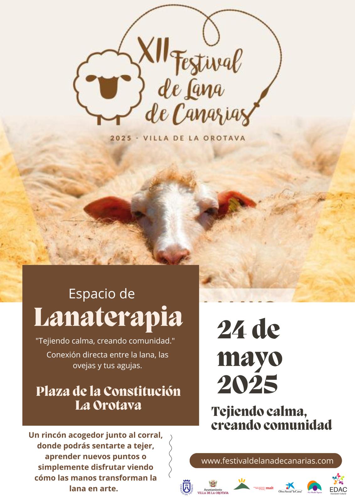 XII Festival de Lana de Canarias – Espacio de Lanaterapia El próximo 24 de mayo de 2025, en la Plaza de la Constitución de La Orotava, podrás disfrutar del Espacio de Lanaterapia: un rincón acogedor junto al corral donde se entrelazan lana, calma y comunidad.