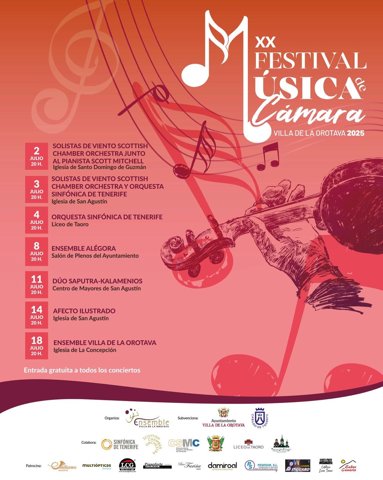 Del 2 al 18 de julio, La Orotava acoge una nueva edición del Festival de Música de Cámara, que celebra su vigésimo aniversario con una programación de altísimo nivel. Este evento reunirá a formaciones de renombre internacional como la Scottish Chamber Orchestra, la Orquesta Sinfónica de Tenerife, y a destacados solistas y ensembles de la escena europea.