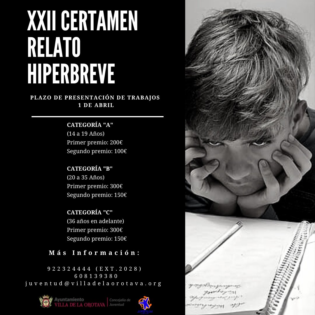 Fecha/Hora: Viernes, 18 Marzo, 2022La concejalía de Juventud convoca un año más este concurso que cumple ya su XXII edición. Plazo de presentación de trabajos: hasta el 1 de abril Más información en https://bit.ly/3sPqBDx