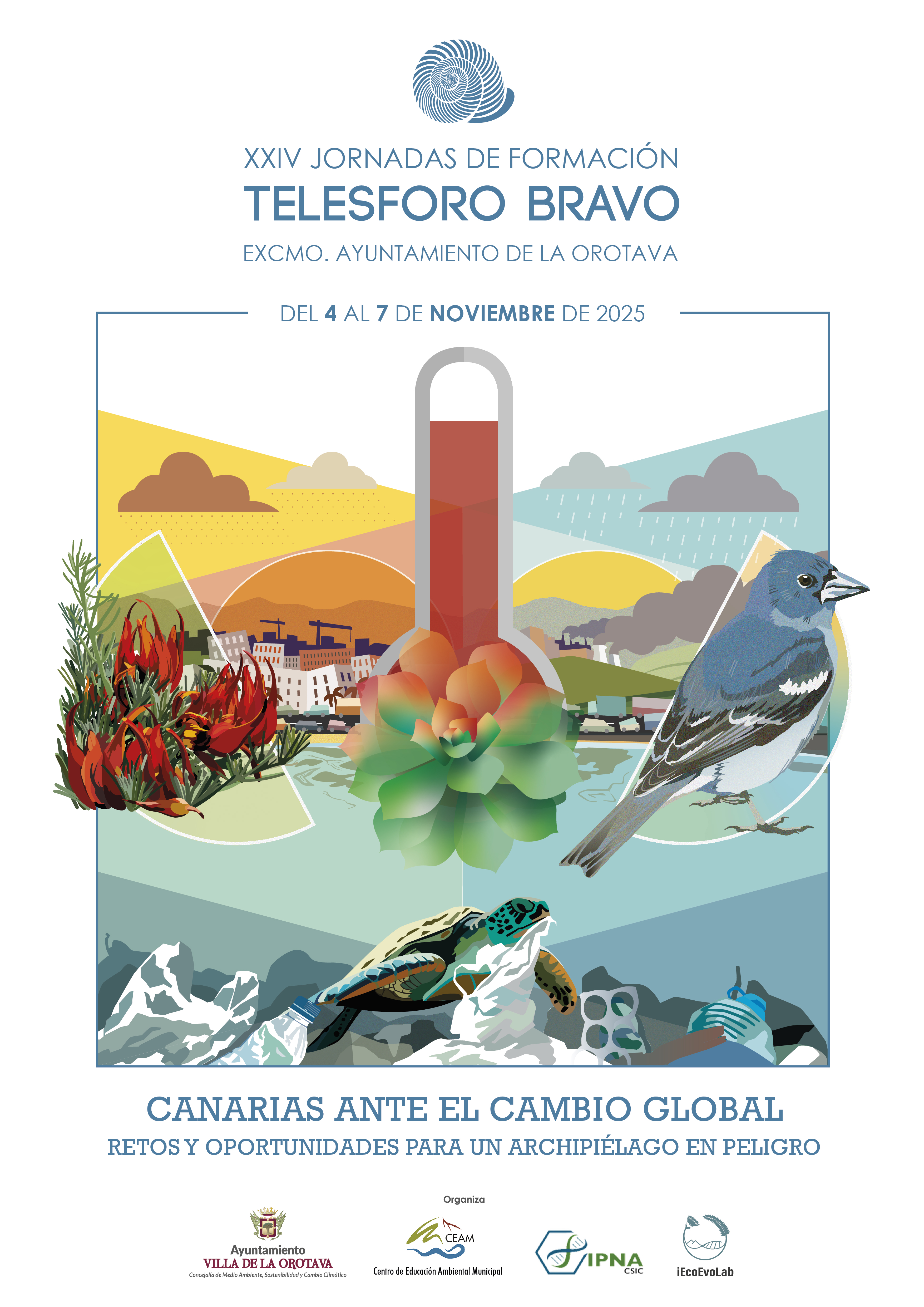 Del 4 al 7 de noviembre de 2025, el Excmo. Ayuntamiento de La Orotava organiza una nueva edición de las Jornadas de Formación Telesforo Bravo. Este año, bajo el lema “Canarias ante el cambio global”, se abordarán los desafíos medioambientales que enfrenta nuestro archipiélago y las oportunidades que surgen para proteger su extraordinaria biodiversidad y su futuro sostenible.