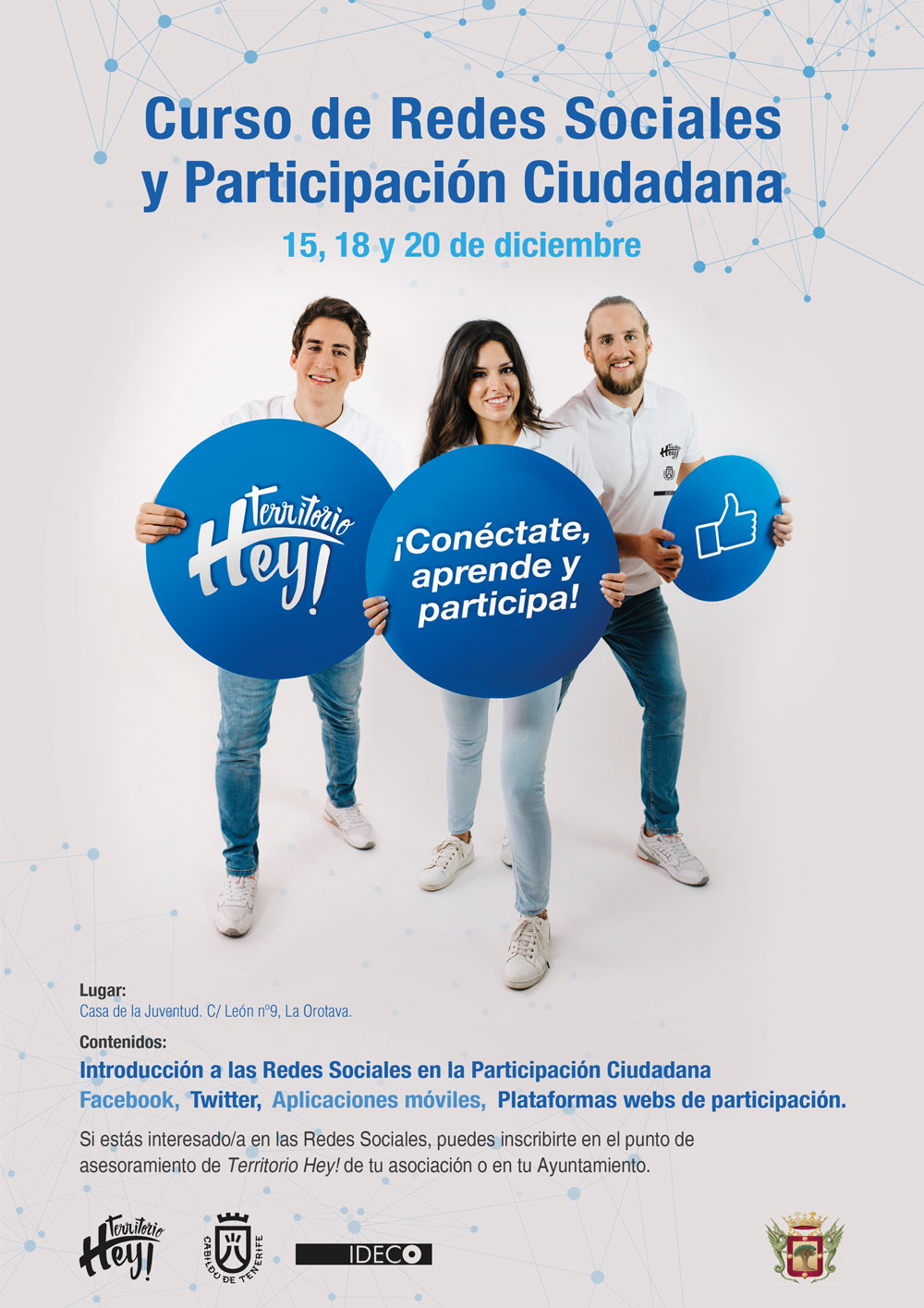 El Cabildo Insular, a través del área de Participación Ciudadana (Terrotorio HEY), en colaboración con el Ayuntamiento de La Orotava, organizan del 15 al 20 de diciembre un taller de redes sociales como herramienta de participación ciudadana dirigido a todas aquellas personas interesadas en comunicar ideas y sacarles el máximo rendimiento como vehículos de opinión pública y transformación social.