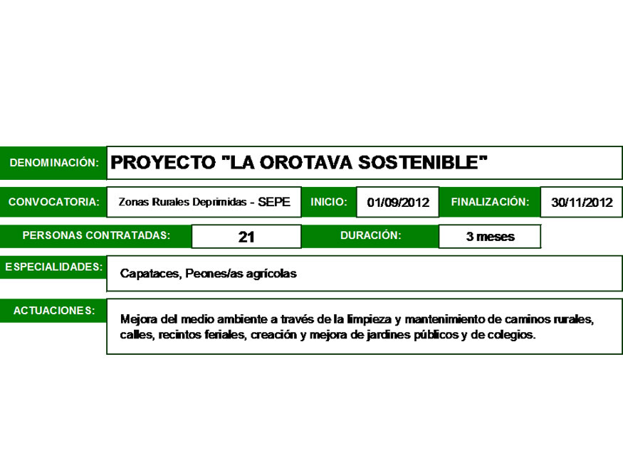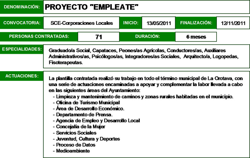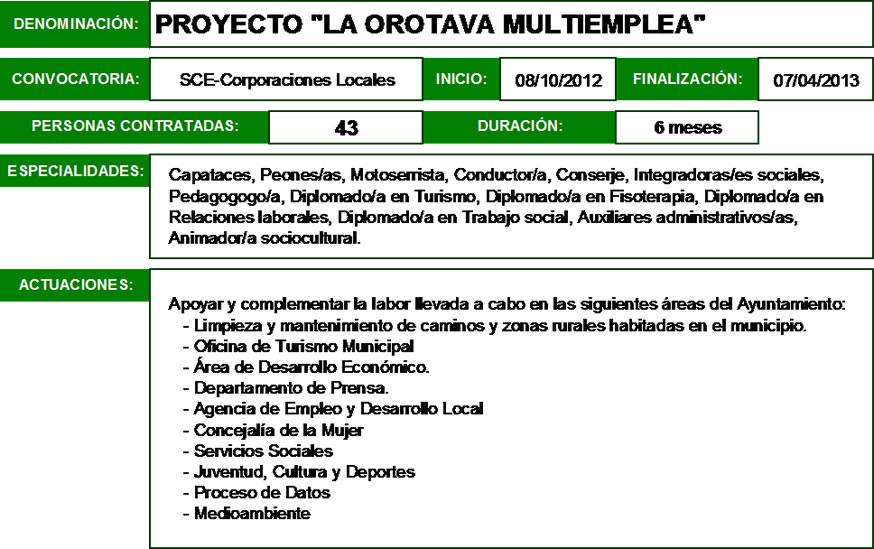 A partir de las necesidades (tanto de empleo como de servicios) detectadas en el Municipio, el Ayuntamiento de La Orotava a través de su Agencia de Empleo y Desarrollo Local, ha elaborado proyectos para las convocatorias publicadas de ambos tipos de programas.