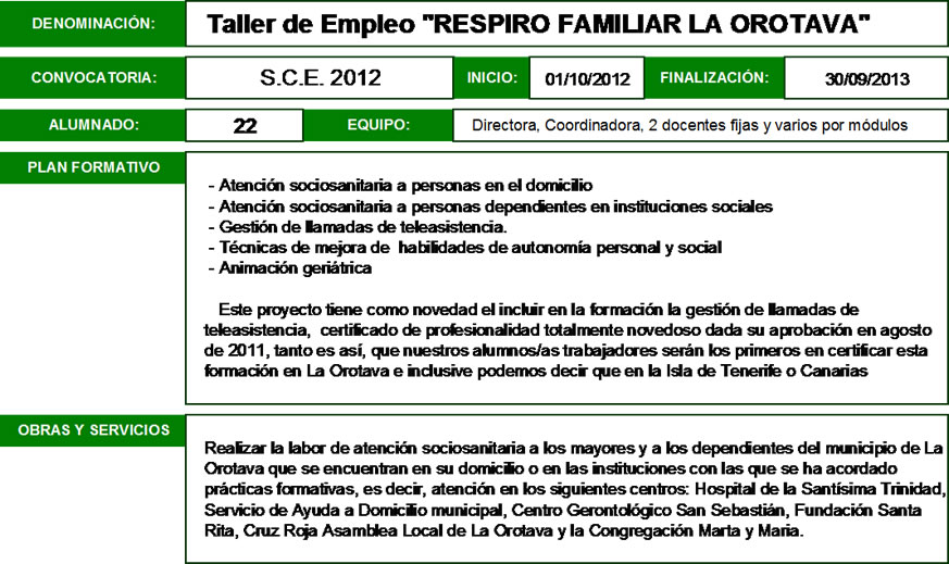 Actualmente se está ejecutando el segundo semestre del Taller de Empleo "RESPIRO FAMILIAR LA OROTAVA".