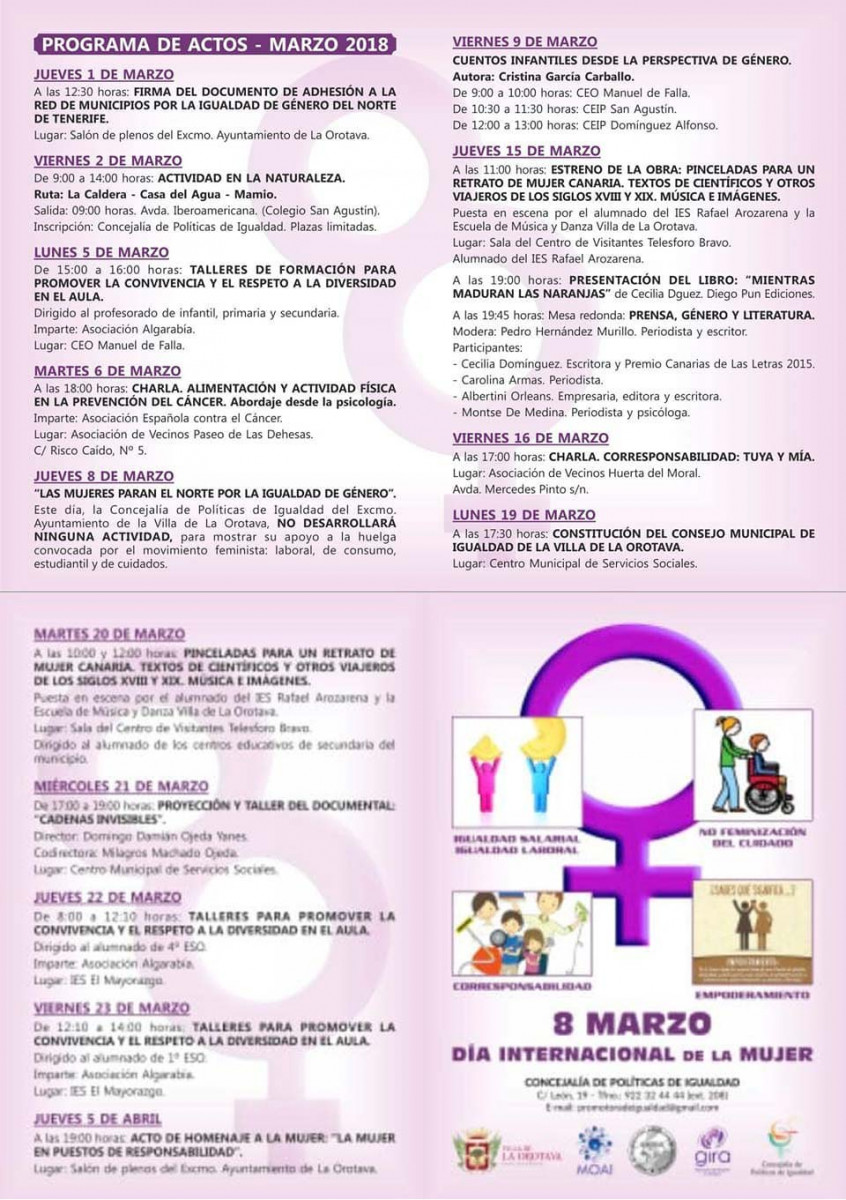 El Día Internacional de la Mujer se celebra cada 8 de marzo, pero para el Ayuntamiento de La Orotava es una singular efeméride por lo que desarrolla un amplio programa de actos para conmemorar esta fecha. Así a lo largo de este mes de marzo y el próximo de abril se desarrollarán diferentes actividades.