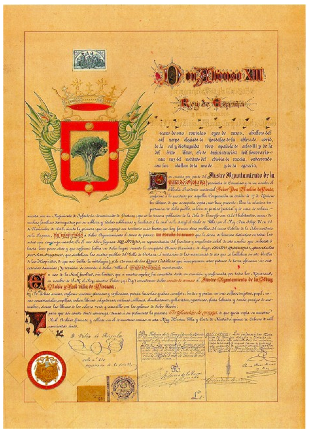 En la sesión plenaria del Excmo. Ayuntamiento de la Villa de La Orotava, celebrada el 30 de marzo de 1905, se establecía "Visto el escudo de armas que concedió a esta Villa, S.M. El Rey Alfonso XIII, con fecha de 15 de febrero último, sello 610 y registrado al folio 23.