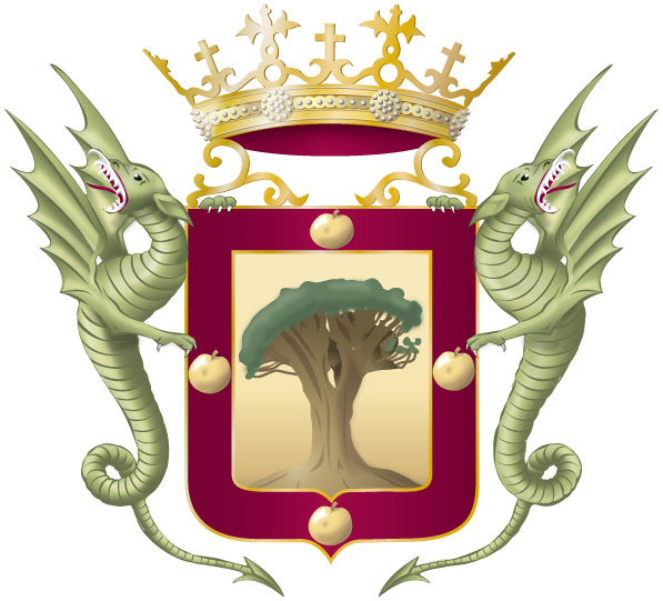 De oro, un drago en su color. Bordura de gules con cuatro manzanas de oro, una en el eje, otra en la punta y una a cada lado. Dos dragones de sinople linguados en gules como soportes. Al timbre, corona real abierta.