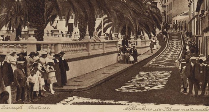 La primera fiesta celebrada en La Orotava, llamada todavía la Aorotava, tuvo lugar el 22 de junio de 1516. La misma consistió en unos pocos divertimentos públicos a fin de festejar la llegada al trono de Castilla del rey Carlos I. Desde entonces se instituyó la Semana Santa y la festividad del Corpus Christi que se implantó en la comarca al poco tiempo de consumarse la conquista. Especial arraigo tuvo en el municipio y ya en 1576 la procesión del Corpus estaba consolidada en La Orotava y además de pasearse la Sagrada Forma por las calles del Centro Histórico se montaban altares en los fronstispicios de las principales mansiones.