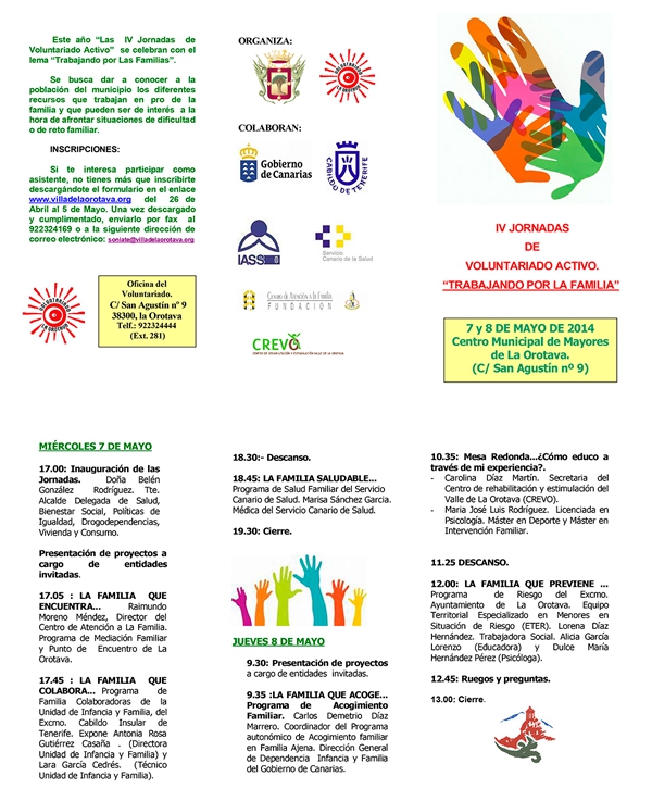La Villa de La Orotava acogerá los días 7 y el 8 de mayo las cuartas Jornadas de Voluntariado Activo, que tendrán lugar en el Centro Municipal de Mayores.