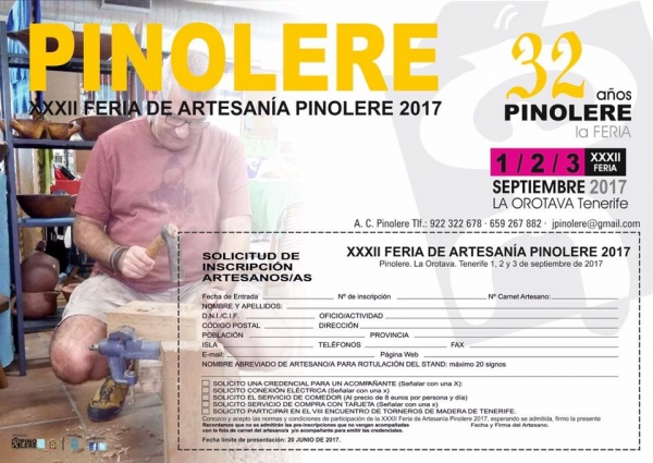 Se abre el plazo oficial de inscripción para artesanos y empresas artesanas que deseen participar en la XXXII FERIA DE ARTESANÍA PINOLERE 2017, que este año se celebra los próximos días 1, 2 y 3 de septiembre de 2017 en el Parque Etnográfico de Pinolere.