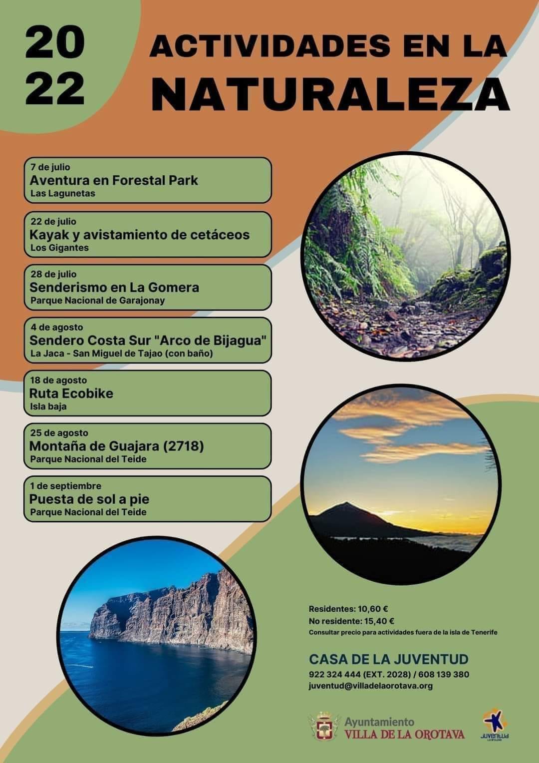 Las actividades están dirigidas a jóvenes de la Villa con edades comprendidas entre los 14 y 35 años de edad con ganas de ocupar su tiempo libre disfrutando de los parajes naturales y de compartir experiencias únicas. Las plazas son limitadas, por ello se recomienda apuntarse lo antes posible en las dependencias de la Casa de la Juventud sita en calle León, 9. El plazo permanecerá abierto hasta días antes de la fecha prevista en cada actividad, siempre que queden plazas libres. También se puede contactar a través del correo electrónico juventud@villadelaorotava.org o llamando al teléfono 922324444 (ext. 2028) o al móvil 608139380. Los residentes en la Villa deben abonar 10´60 euros, y 15´40 €, los no residentes; excepto la actividad fuera de la isla de Tenerife.