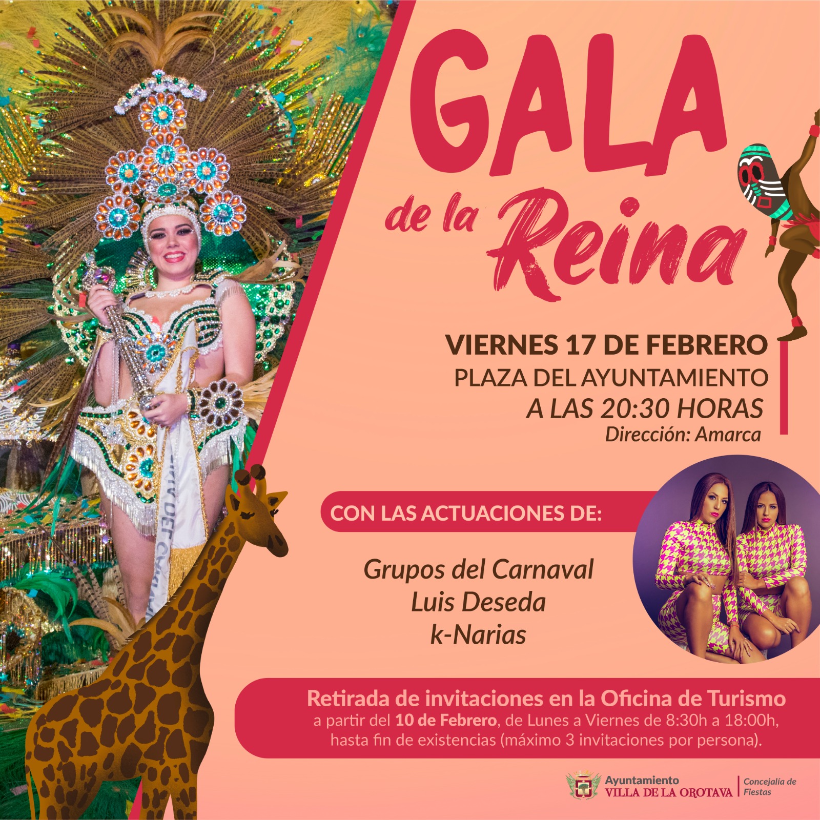 La decoración del escenario con el juego de luces y sonido sumarán al gran espectáculo que protagonizarán los propios grupos del carnaval villero: Fanfarria Peña el Casco que cumple su 60 aniversario, Virgueritos, Pizzicatos, Trinkosos, Apresuradas, Minivirgues, comparsa Los Villeros, rondalla Volcanes del Teide, y otros colectivos coreográficos. Se contará con las actuaciones estelares de las K-Narias y Luis Deseda. La Gala será dirigida por Sergio López e Itahisa García, de la entidad Amarca, y presentada por Elvis Sanfiel.