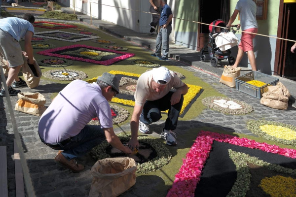 Desde bien temprano cientos de personas, de todas las edades, se afanan en elaborar las bonitas alfombras de flores que tapizarán el recorrido de la procesión del Corpus Cristi. El ambiente es inigualable en este recorrido por las alfombras en pleno proceso de elaboración.