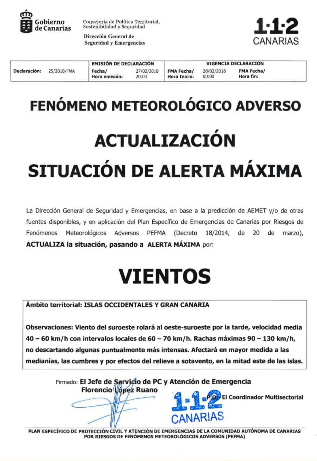 La suspensión de las actividades incluye también el ámbito universitario y la agenda pública de la Consejería de Educación y Universidades. En estas islas, el Gobierno de Canarias ha declarado la situación de alerta por Vientos, además de la alerta por Fenómenos Costeros (también declarada en Lanzarote y Fuerteventura). La declaración de alerta se produce tras estudiar la información facilitada por la Agencia Estatal de Meteorología y otras fuentes disponibles, y en aplicación del Plan de Protección Civil por Fenómeno Meteorológico Adverso (PEFMA).