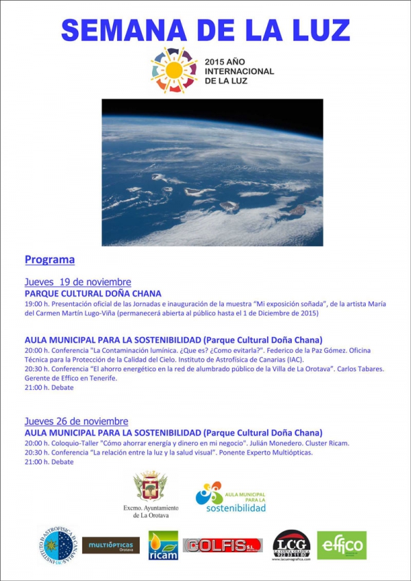 El ayuntamiento de La Orotava, a través del Aula Municipal para la Sostenibilidad, organiza a partir de este jueves 19 de noviembre unas jornadas dedicadas a concienciar a la sociedad sobre la importancia de las tecnologías lumínicas para solucionar problemas mundiales sobre el desarrollo sostenible, la energía, educación, agricultura y salud.
