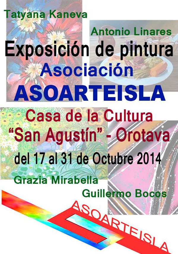 En los lienzos de Grazia Mirabella, los colores son como versos: la artista italiana pinta los relatos, los secretos, los encantos de la isla que la enamoró, haciendo de su experiencia un poema gracias a la imaginación de su mirada. También la obra de Tatyana Kaneva, con formación en Sliven y Sofia (Bulgaria), hace percibir al que mira mucho más que colores: sus lienzos , con acrílico y materiales naturales, en estilo decorativo con su toque feminino , evocan incluso sutiles aromas. Por otro lado, Guillermo Bocos expresa en esta ocasión la fuerza de esta tierra, las sensaciones más profundas y las más superfluas que el día al día le evoca. Los colores básicos y técnicas varias crean un paisaje donde jugar a encontrar formas, como en las nubes: cada quien las suyas. Asimismo, Antonio Linares, nacido en costas mediterráneas, presentará tanto obras de arte abstracto geométrico, como paisajes al óleo. En todas ellas entiende el color como una manera de crear formas y sensaciones que brindar al espectador.