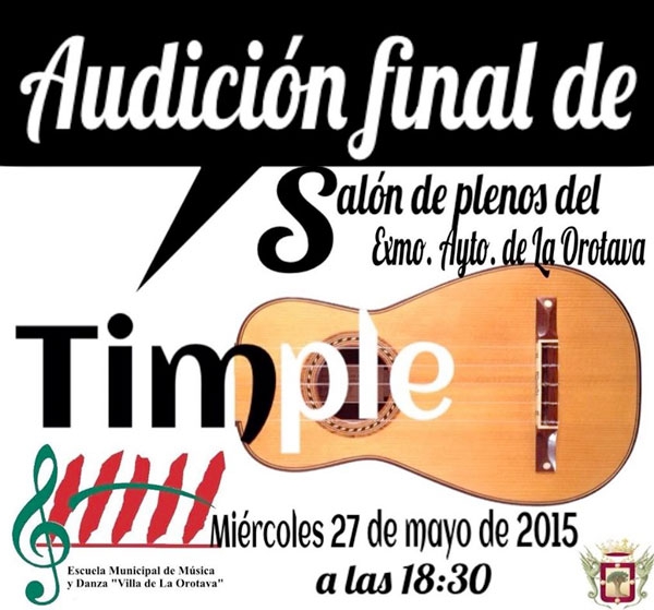 Este miércoles 27 de mayo a las 18:30 en el Salón de Plenos del Ayuntamiento de La Orotava, será la última audición de los alumnos de Timple de la Escuela Municipal de Música y Danza "Villa de La Orotava" (EMMDVO), dirigidos por el experto timplista Pedro Izquierdo.