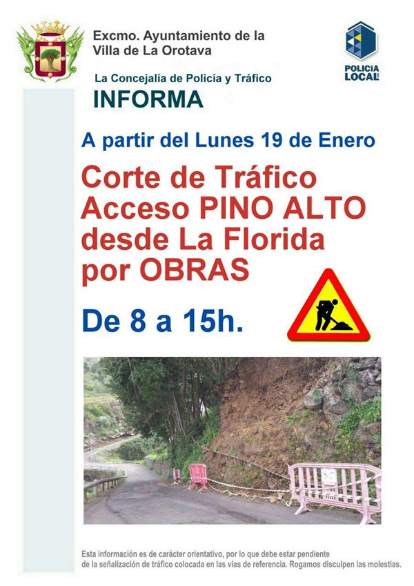 15/01/2015A partir del próximo lunes cortes temporales de acceso a Pino Alto desde La Florida con motivo de las Obras de Reconstrucción del muro afectado por los desprendimientos de las últimas lluvias para garantizar la seguridad de los vecinos.