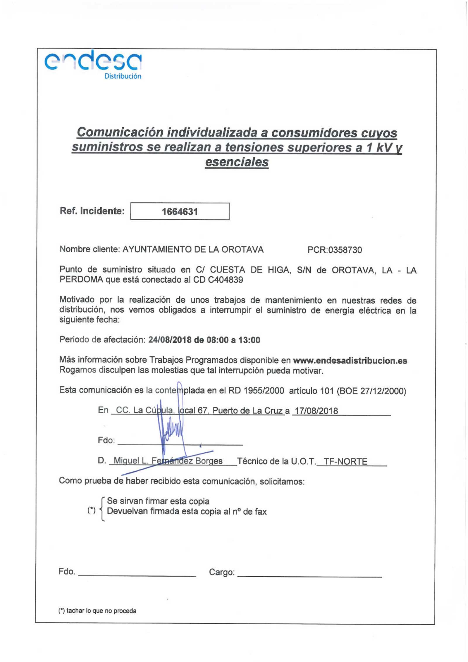 El 24 de agosto se llevarán a cabo cortes temporales del suministro eléctrico que afectará a la zona de Cuesta de Higa en La Perdoma, La Orotava.