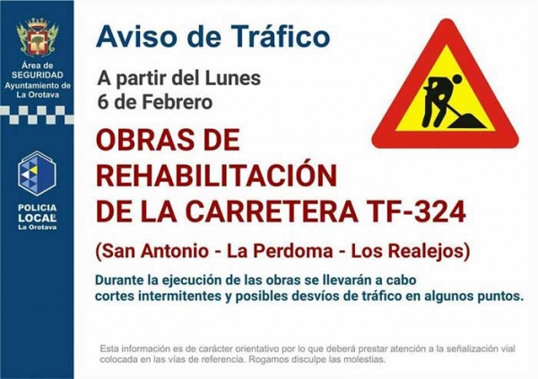- Aviso de tráfico con motivo de las obras de asfalto de la Carretera TF-324, de La Orotava a La Perdoma que comienzan este lunes 6 febrero