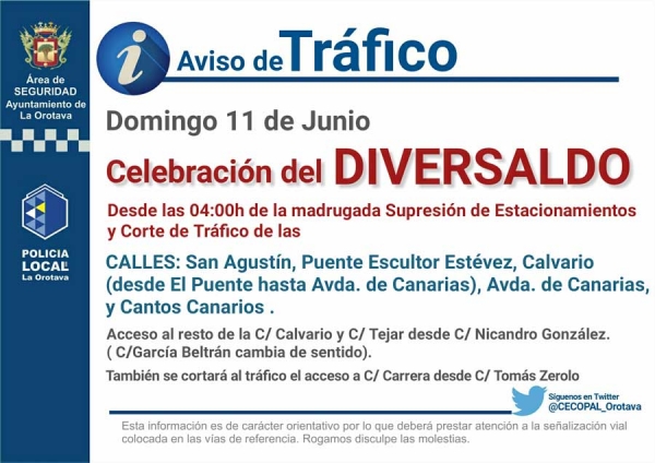 Aviso de tráfico para el domingo, 11 de junio, por la celebración de Diversaldo