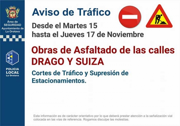 Aviso de tráfico por obras de asfaltado en las calles Drago y Suiza