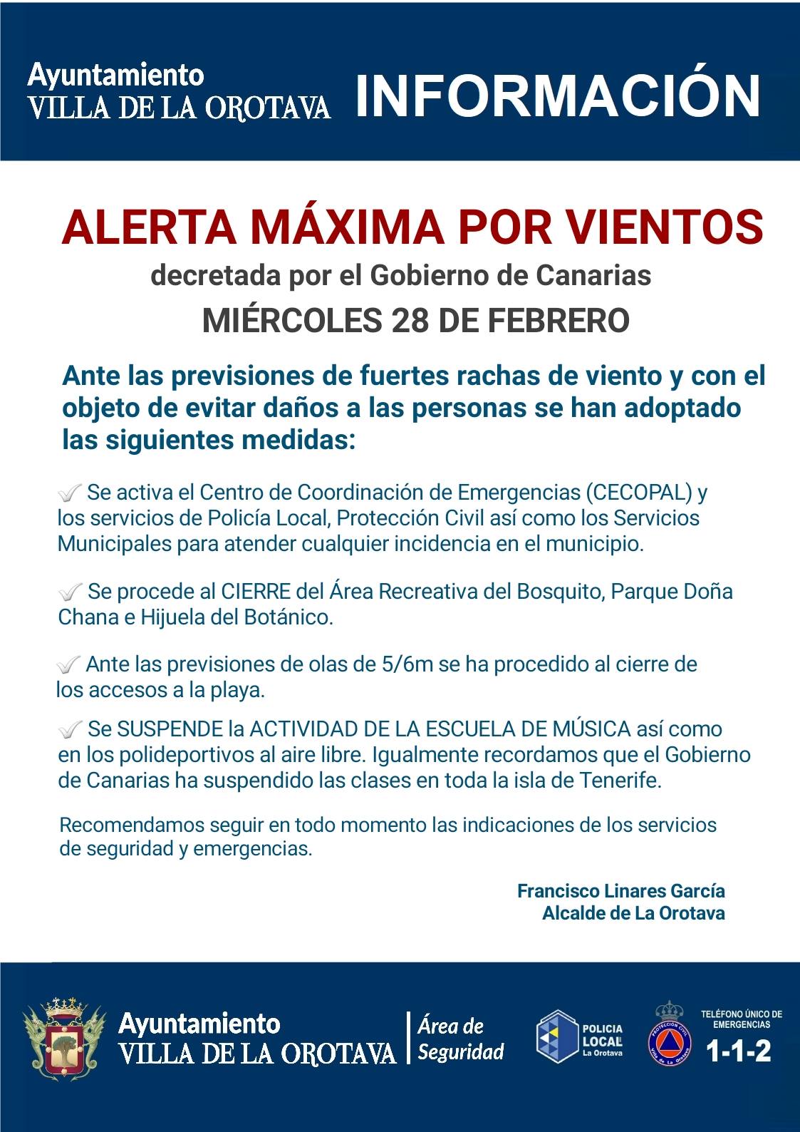 • Rogamos en todo momento seguir las recomendaciones de los servicios de seguridad y emergencia. Y seguir las cuentas oficiales Prensa Ayuntamiento de La Orotava y Protección Civil de La Orotava (Facebook) y @112canarias y @CECOPAL_Orotava