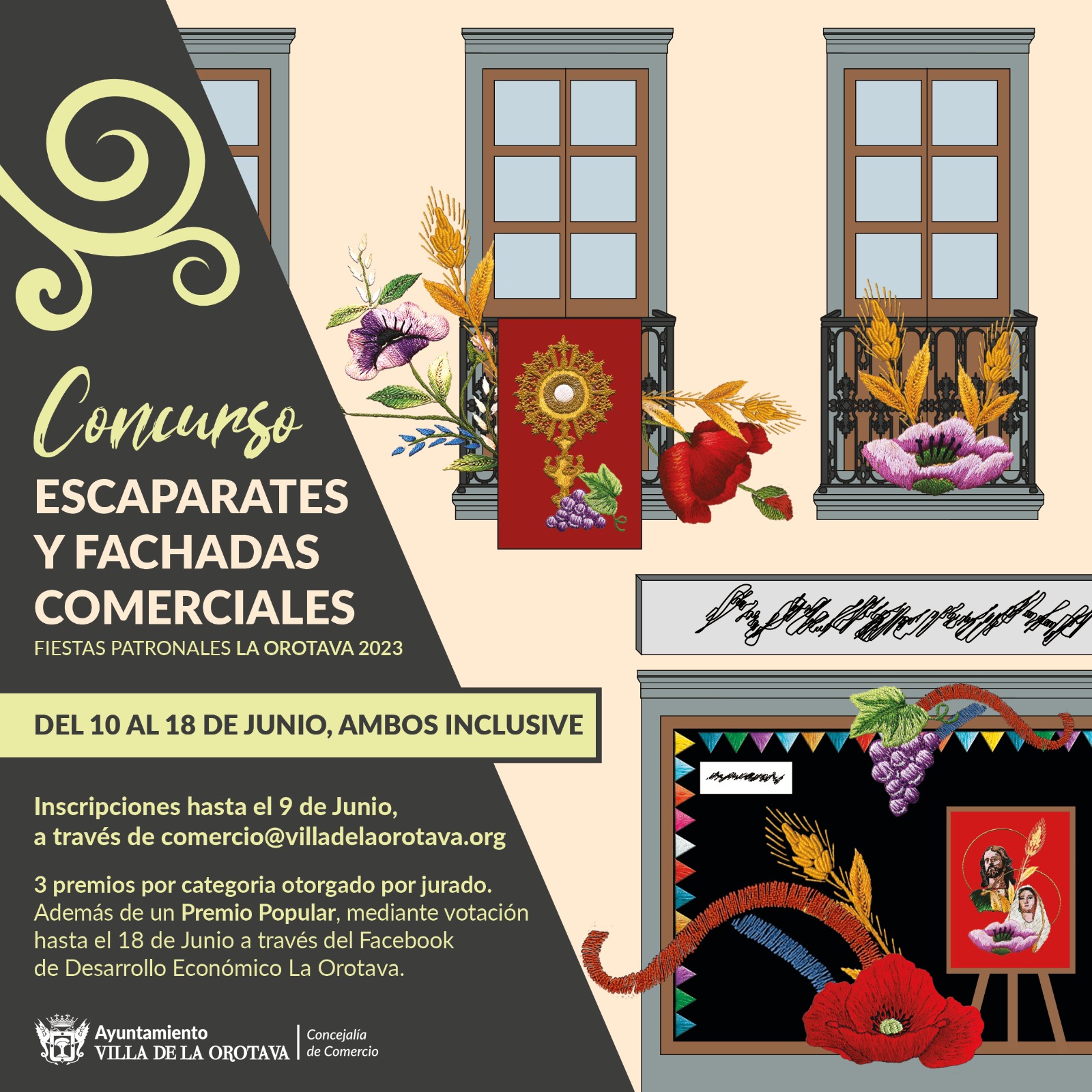 PRIMERA.- Con el objeto de que los escaparates y fachadas comerciales del municipio estén acorde con las Fiestas Mayores en honor al Corpus Christi y San Isidro Labrador y Santa María de La Cabeza, el Ayuntamiento de La Orotava a través de la Concejalía de Comercio convoca el Concurso objeto de las presentes bases.