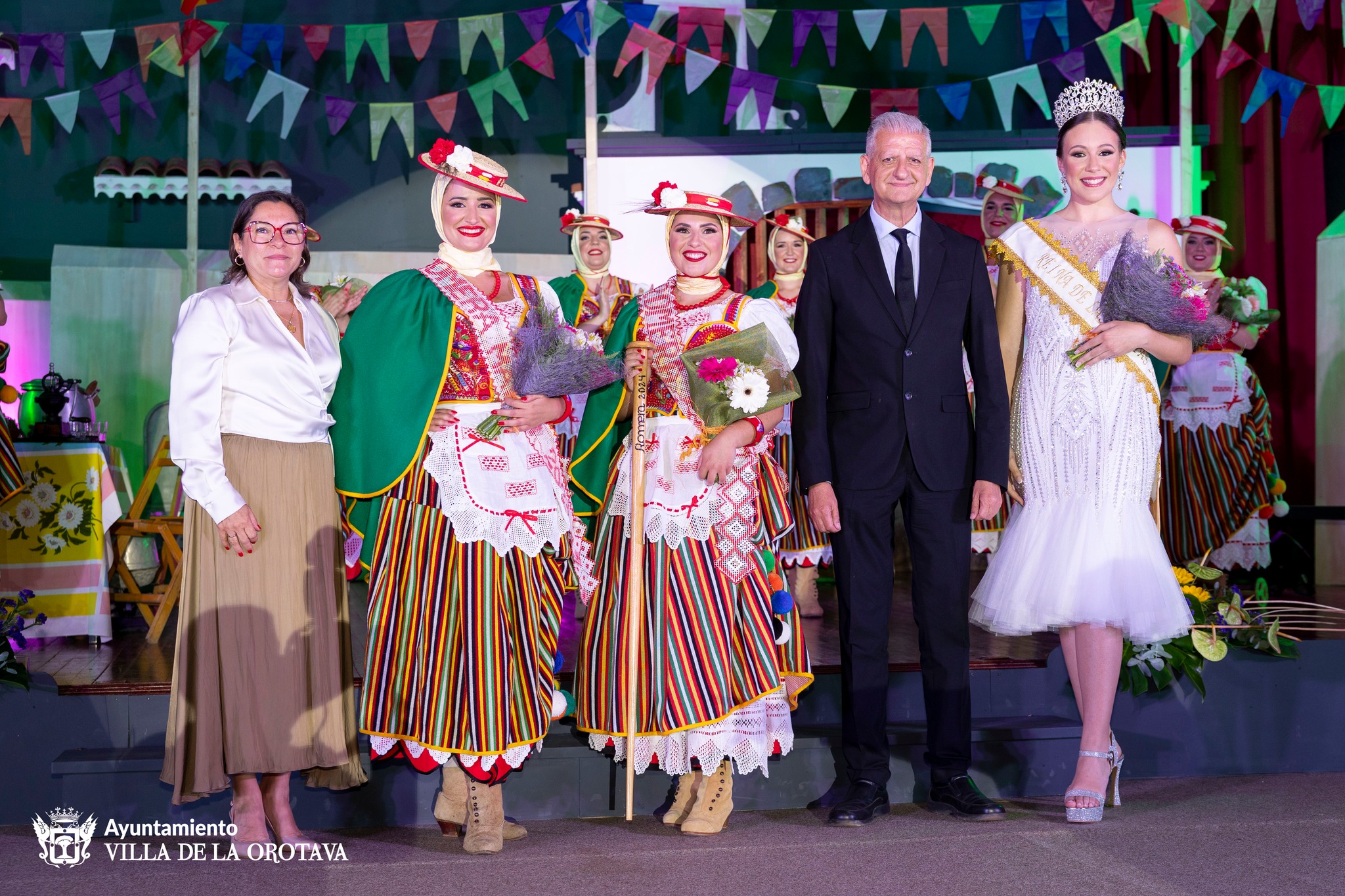 La nueva Romera Mayor recibió la banda acreditativa de manos del alcalde orotavense, Francisco Linares, y de la presidenta del Liceo, Carmen Leyes, junto a la anterior romera mayor, Cristina González Hernández. La gala contó con la actuación de la compañía Jeita y el grupo folclórico Oroval.