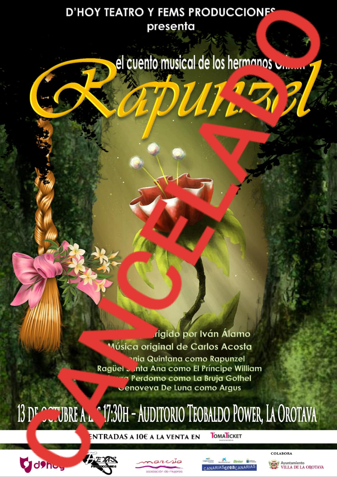 Por razones ajenas al Ayuntamiento de La Orotava, queda cancelada la representación de la obra RAPUNZEL prevista para el próximo día 13 de octubre de 2019 en el Auditorio Teobaldo Power de esa localidad.