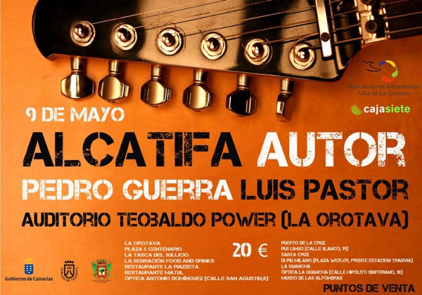 La Asociación de Alfombristas de La Orotava ha decidido cancelar el concierto de Luis Pastor y Pedro Guerra que iba a celebrase este sábado, 9 de mayo, a las 20.00 horas, dentro del festival Alcatifa Autor. La organización lamenta los inconvenientes que haya podido ocasionar, pero motivos técnicos obligan a postergar la celebración del festival hasta el año que viene.