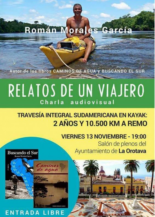 El Salón de Plenos del Ayuntamiento de La Orotava acoge el viernes 13 de noviembre a partir de las 19:00 horas, una charla que ofrecerá Román Morales sobre la travesía integral sudamericana que realizó en Kayak recorriendo durante dos años 10.500 kilómetros a remo.