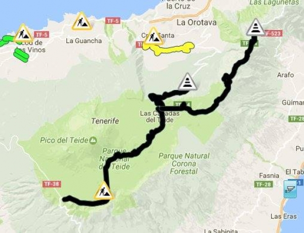 La TF 21 que conecta La Orotava y Granadilla de Abona se encuentra cortada en el punto kilométrico 24 (Ramón Caminero) hasta el punto kilométrico 53 (cruce de Boca Tauce).