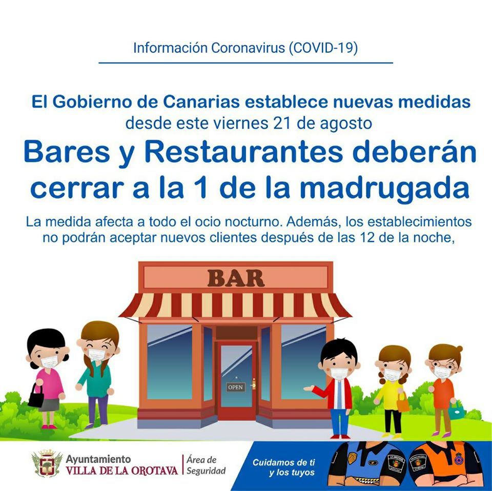 Nueva información sobre el Covid-19 El Gobierno de Canarias establece nuevas medidas para controlar la transmisión de la #COVID19. Cierre completo de las actividades de ocio nocturno. El cierre de los establecimientos de hostelería y restauración será a las 01:00h.