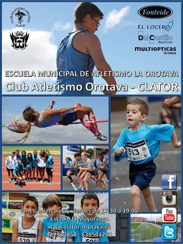 El Complejo de Atletismo El Mayorazgo vuelve a acoger un año mas a todos los niños y niñas amantes de este deporte en la Villa de La Orotava. El horario sigue siendo el mismo que en temporadas pasadas, todos los lunes, miércoles y viernes de 17:30 a 19:00 horas. Para más información pueden pasar por nuestra oficina en el mismo horario de entrenamiento, llamando a los teléfonos 922330858 ó 636544261, a través de nuestra web www.clator-orotava.es, el correo electrónico clator-orotava@hotmail.com, o bien mediante nuestro perfil de Facebook (Clator Orotava). Te esperamos.