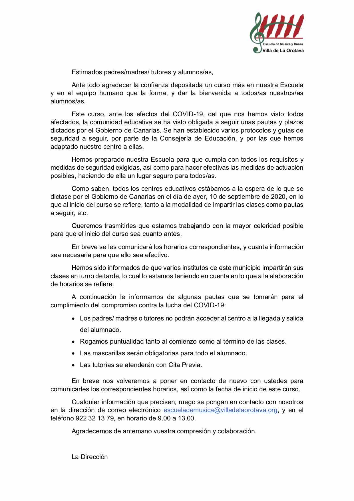 COMUNICADO DE LA ESCUELA MUNICIPAL DE MÚSICA Y DANZA POR EL INICIO DEL CURSO 2020/2021