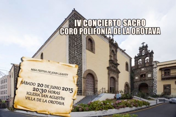 La Iglesia de San Agustín acoge el próximo sábado, 20 de junio, a partir de las 20:30 horas, el IV concierto sacro a cargo del Coro Polifonía de La Orotava que interpretará un programa con obras de autores de diferentes siglos y diferentes estilos, destacando la presentación de la Misa Festiva de John Leavitt.
