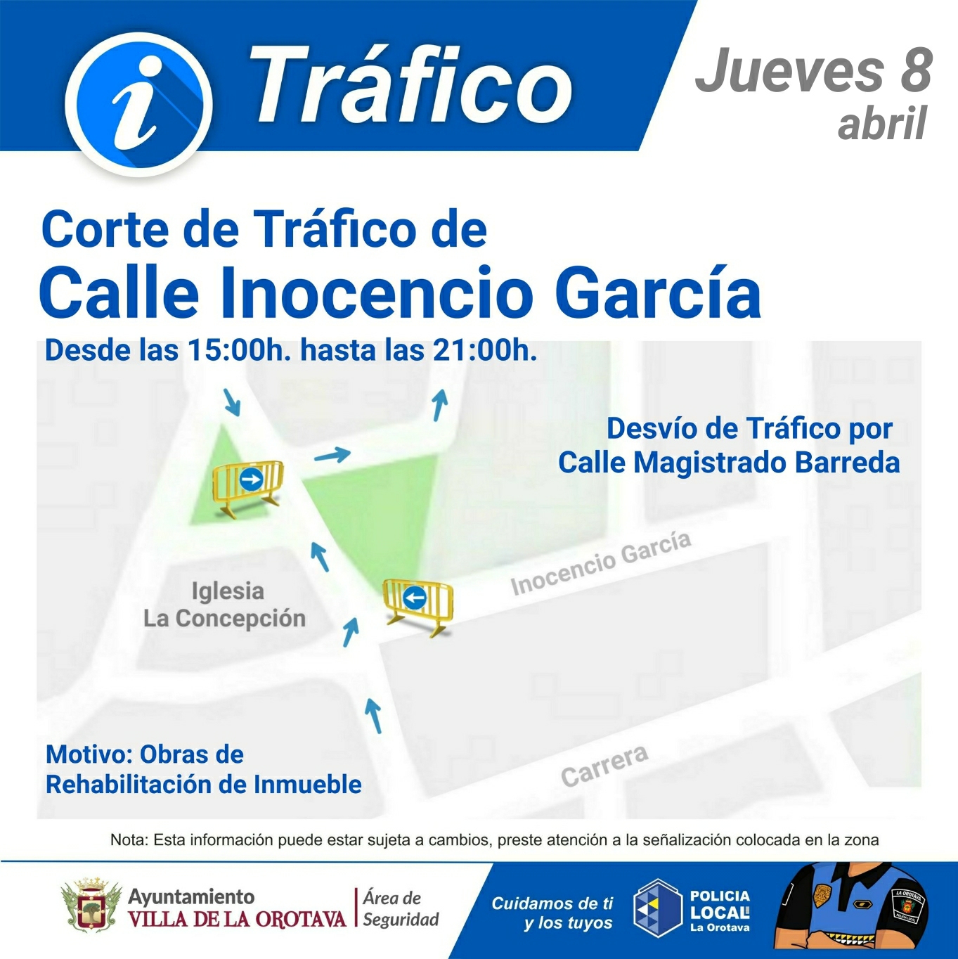 La Concejalía de Seguridad del Ayuntamiento de La Orotava anuncia que este jueves 8 de abril, entre las 15:00 y las 21:00 horas, permanecerá cortada al tráfico la calle Inocencio García, desvíándose el mismo por la calle Magistrado Barreda. El motivo es las obras de rehabilitación de uno de los inmuebles ubicados en dicha calle.