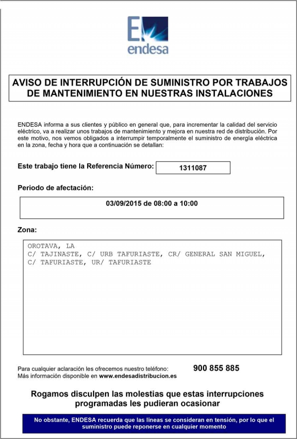 Asimismo, habrá otro corte el 11 de septiembre en el punto de suministro CD 401489 ubicado en la C/ Risco Caído, en horario de 07:00 a 12:00 horas: