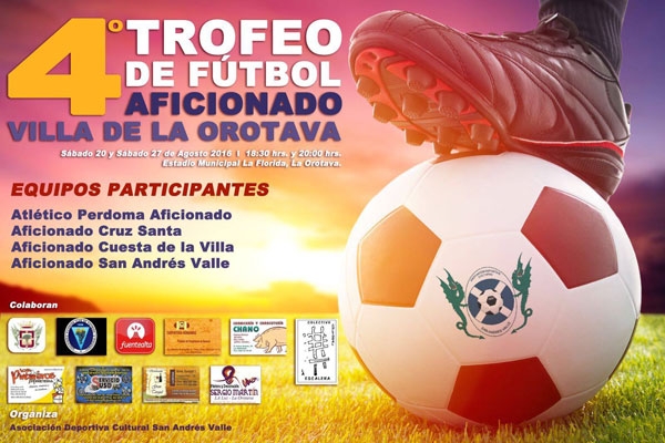 La Villa acoge este mes de agosto el cuarto trofeo de fútbol aficionado “Villa de La Orotava”. En concreto este acontecimiento deportivo se disputará los sábados 20 y 27 de agosto, y contará con la participación de cuatro equipos que lucharán por hacerse con la victoria: San Andrés Valle, Atlético Perdoma AF, AF Cruz Santa y AF Cuesta de la Villa.