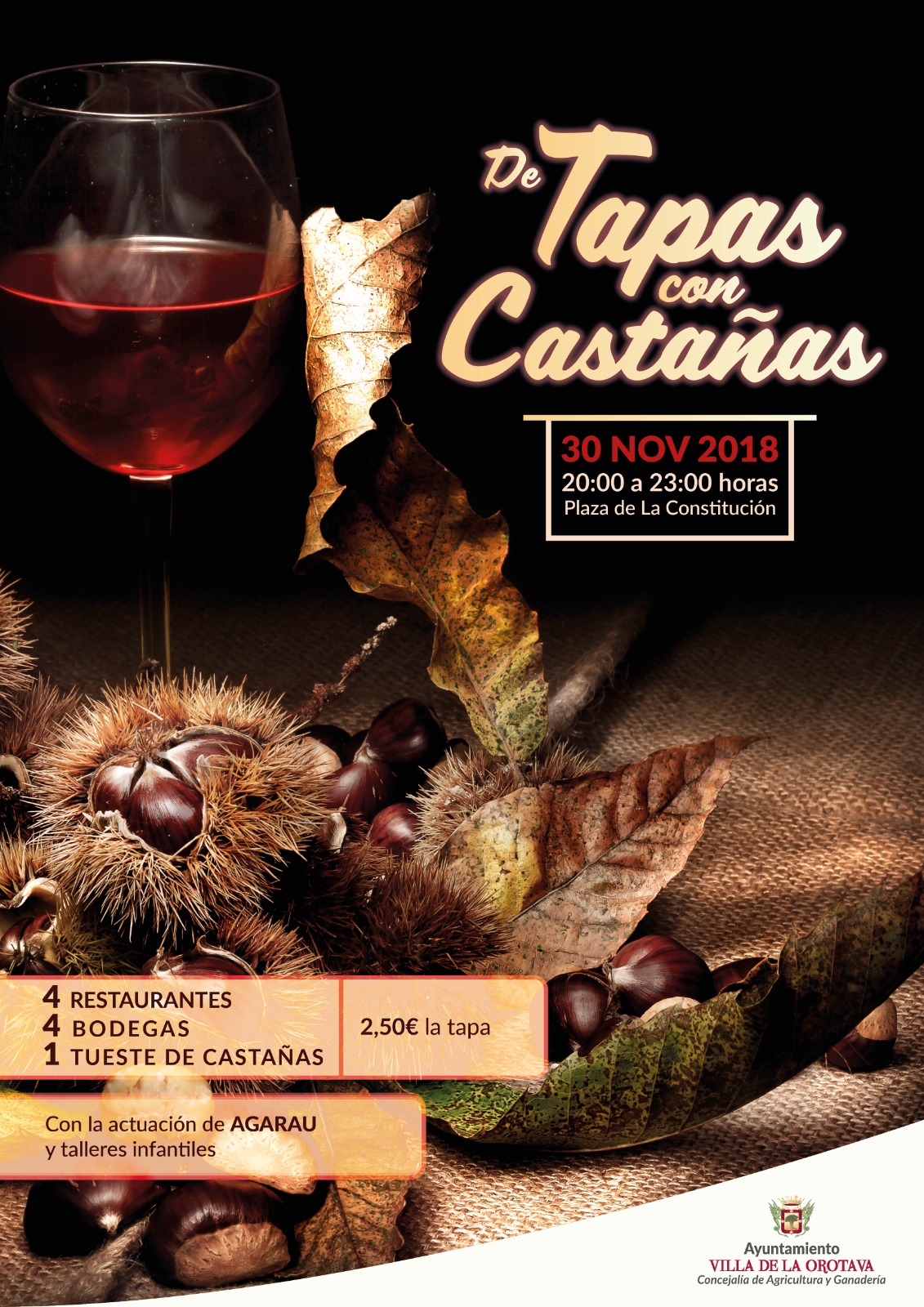 El viernes 30 de noviembre, tras la inauguración del Alumbrado Ornamental Navideño que será a las 19:30 horas en la Plaza del Ayuntamiento, se podrá disfrutar en la Plaza de la Constitución de un gran evento que se vincula a la tradición y festividad de San Andrés: 'De Tapas con Castañas', que cumple ya su tercera edición. Este evento es organizado por la Concejalía de Agricultura del Consistorio villero, que dirige Alexis Pacheco, y que lleva a cabo desde hace tiempo un importante proyecto de recuperar y poner en valor el cultivo de la castaña.