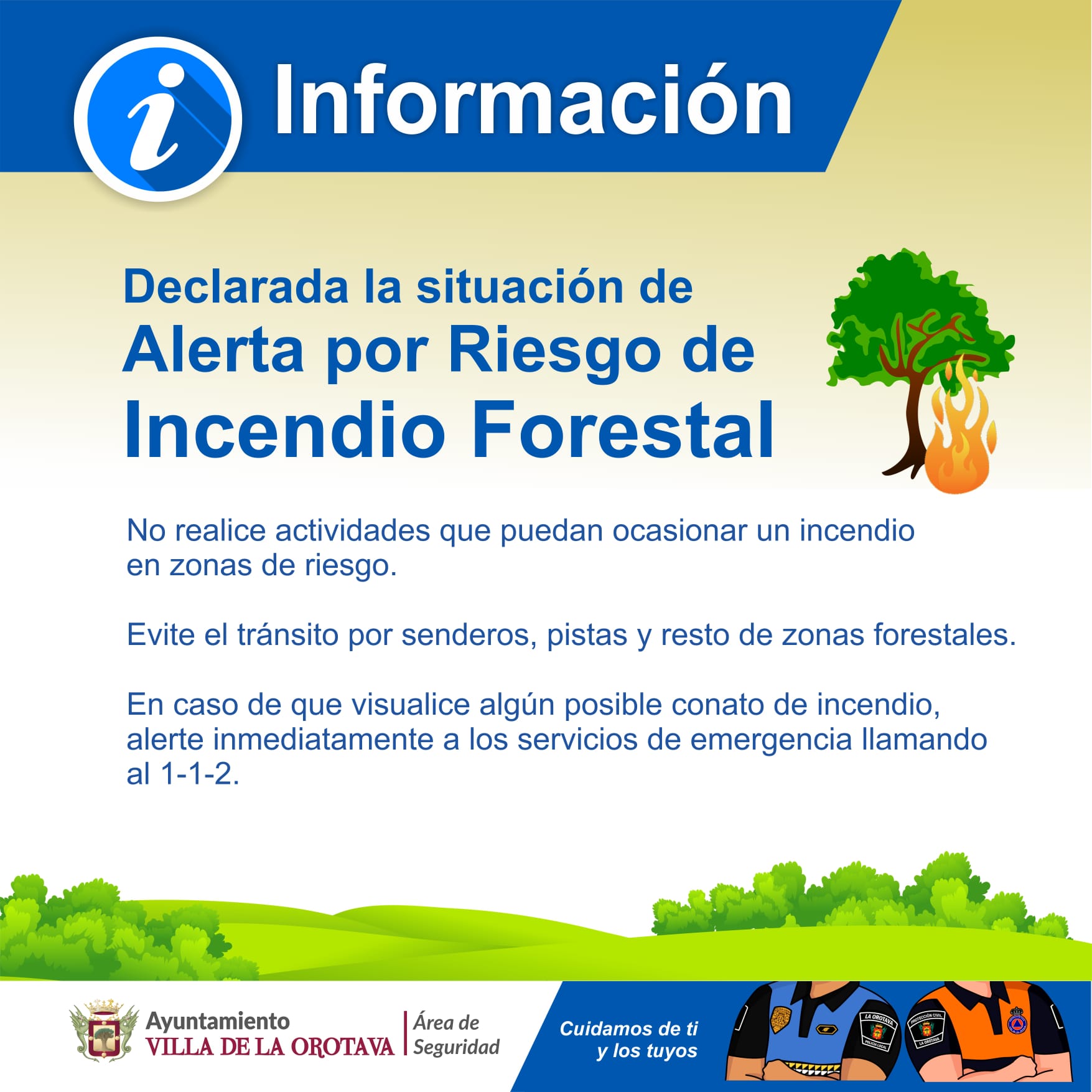 En caso de que visualice algún posible conato de incendio, alerte inmediatamente a los servicios de emergencia llamando al 1-1-2.