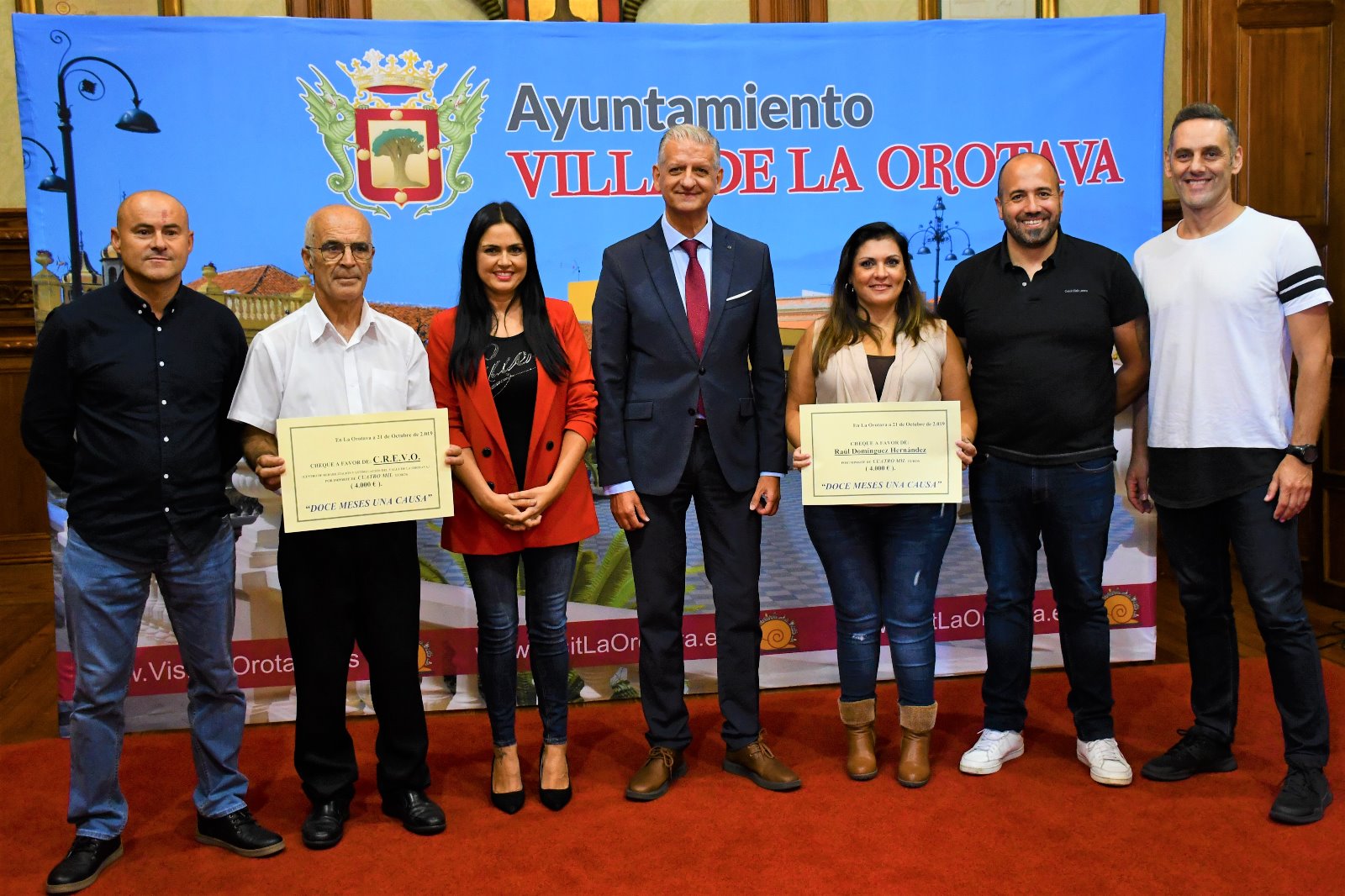 El alcalde de La Orotava Francisco Linares y la concejala Yurena Luis fueron testigos de la entrega de lo recaudado de la mano de representantes del colectivo ‘Docemesesunacausa’.