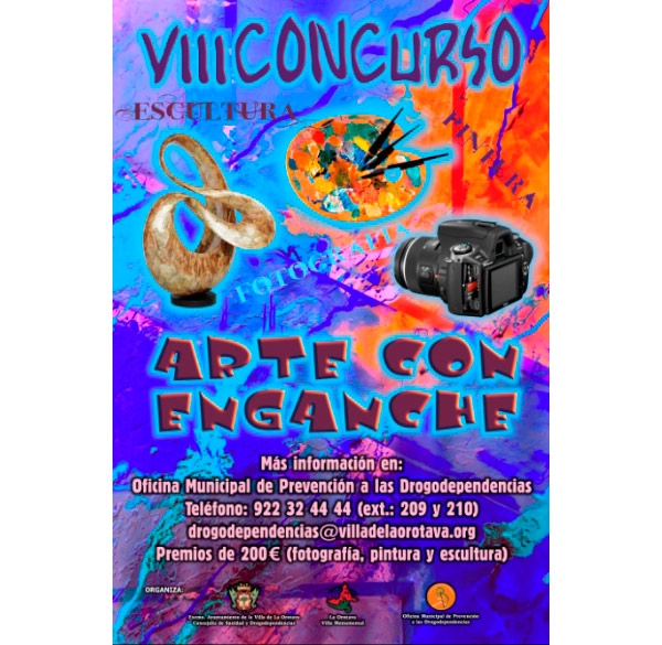 La Concejalía de Drogodependencias ha convocado la octava edición del concurso "Arte con Enganche" que integra tres modalidades artísticas distintas: pintura, escultura y fotografía. El certamen comprende dos categorías por edades: la A para los que tienen entre 14 y 25 años de edad, y la B para personas mayores de 25 años; si bien se ha establecido la misma cuantía de 200 euros como premio para cada modalidad del certamen (pintura, fotografía y escultura), existiendo la posibilidad de conceder accésit o mención especial a los trabajos presentados que en base a la calidad así lo considere o que los premios se declaren desiertos. Las personas interesadas en participar en el concurso tienen de plazo hasta el próximo 18 de abril para entregar sus trabajos en el Registro General del Ayuntamiento.