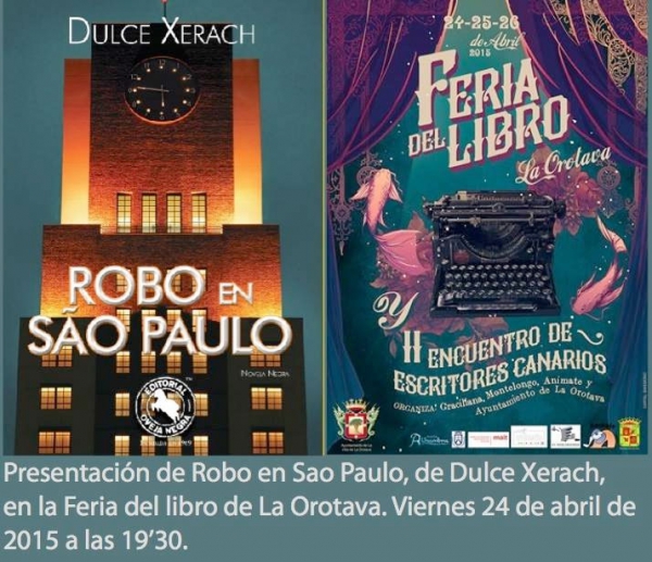 Dulce Xerach estará presente en la Feria de Libro de La Orotava, presentando su primera novela bajo el título Robo en São Paulo. Será el viernes 24 de abril a las 19:30 horas.