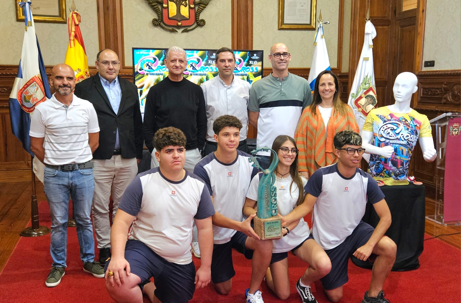 El Salón Noble de la Casa Consistorial acogió este lunes [6 de mayo] la presentación del popular Cross María Auxiliadora, que en esta edición cumple su cuadragésima sexta edición. En el evento se contó con el alcalde Francisco Linares; el edil delegado de Deportes, Carlos Díaz; el director titular del Colegio Salesianos-San Isidro de La Orotava, Bernabé Arjona, y Juan Jesús García, director de la carrera. También se contó con alumnos de 4º de la ESO y los respectivos docentes.