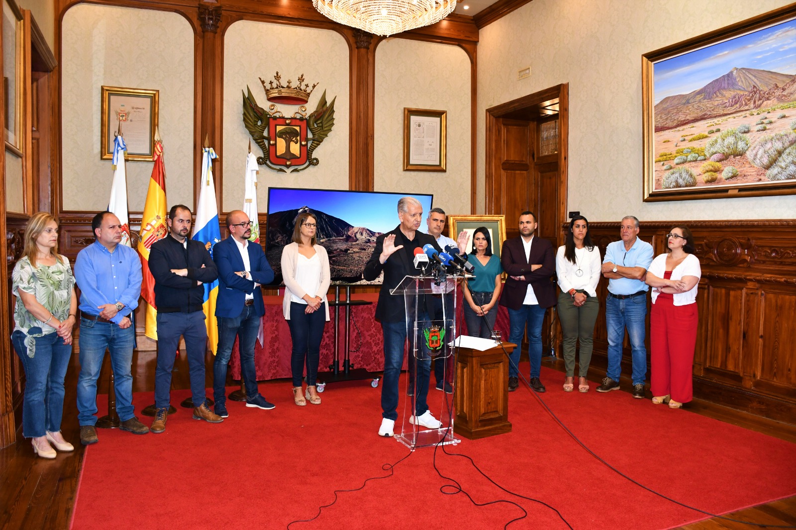 El alcalde de La Orotava, Francisco Linares, compareció hoy [martes 14 de junio] junto a su equipo de gobierno, para mostrar el rechazo al nuevo Plan Rector de Uso y Gestión (PRUG) para el Parque Nacional del Teide y expresó la preocupación con este asunto ante las numerosas quejas de la ciudadanía y de múltiples colectivos. El primer representante institucional incidió en que se aboga por la regulación, por la protección y el control como es lógico. “Estamos a favor de un plan con sentido común, pero no con un documento que se basa en la prohibición”, por lo que concluyó pidiendo que “se devuelva y comience desde cero, ampliando los plazos y dejando que la ciudadanía participe".