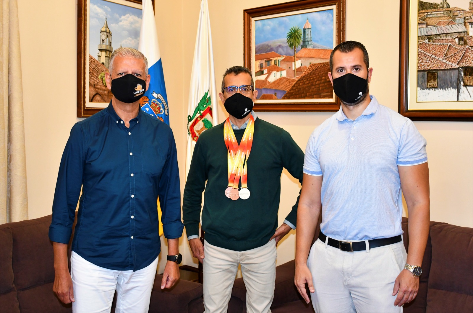 El alcalde de La Orotava, Francisco Linares, y el concejal de Deportes, Antonio Lima, recibieron en las dependencias del consistorio de la Villa al atleta Jorge Antonio Fernández, vigente campeón de España Master M55 ‘al aire libre’ en la modalidad de obstáculos.