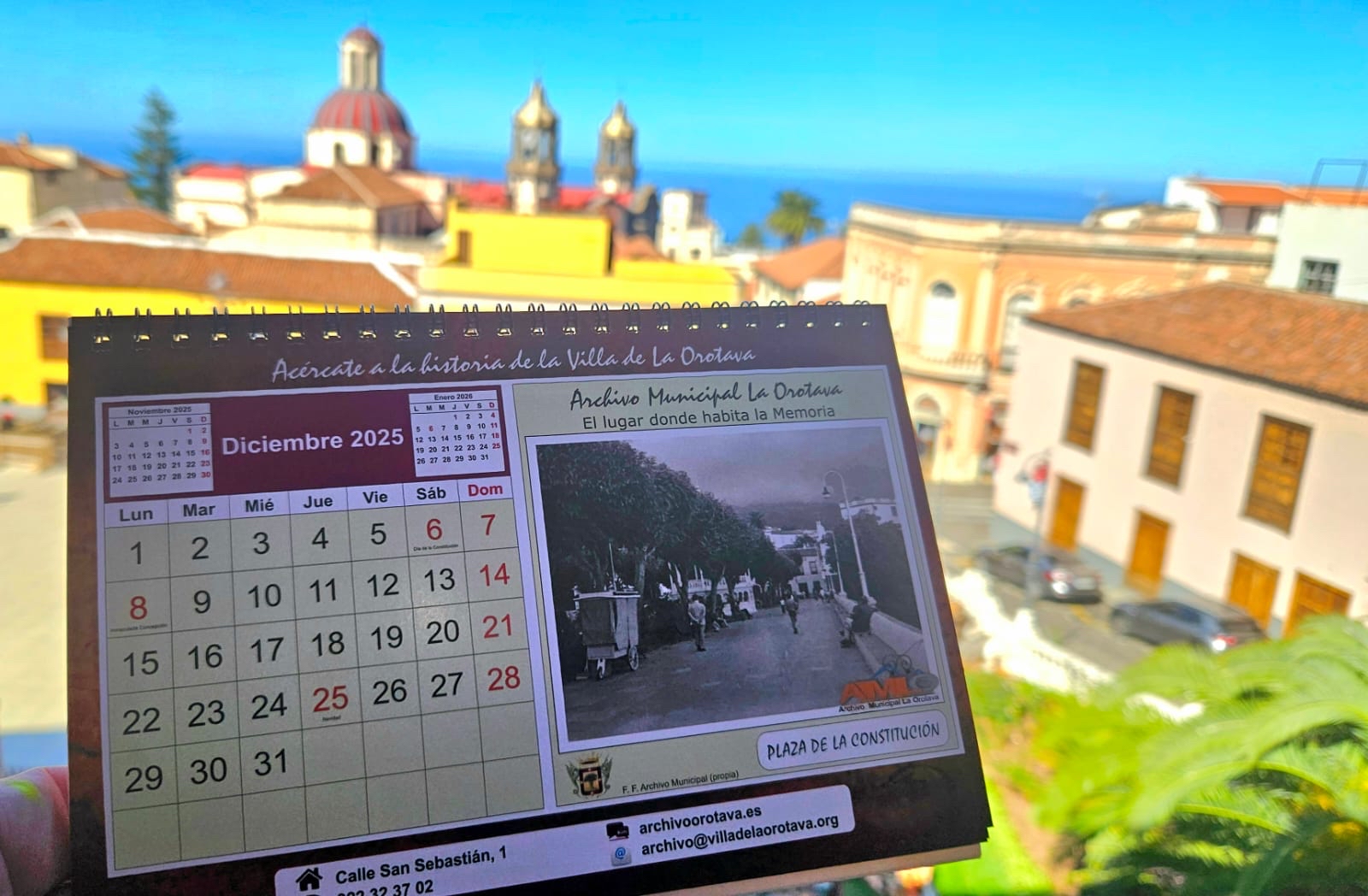 Un año más, el Archivo Municipal de La Orotava ha confeccionado el calendario del próximo año con fotos antiguas de La Orotava, tanto propias del Archivo Municipal como donadas por ciudadanos a los que se agradece su contribución para conservar la historia de La Orotava. El calendario es totalmente gratuito y está disponible tanto el modelo de bolsillo como el de sobremesa. Cualquier persona interesada en este calendario de sobremesa o el de bolsillo puede pasar por el Archivo Municipal a retirarlo, en horario de 11:30 horas a 13:30 horas.
